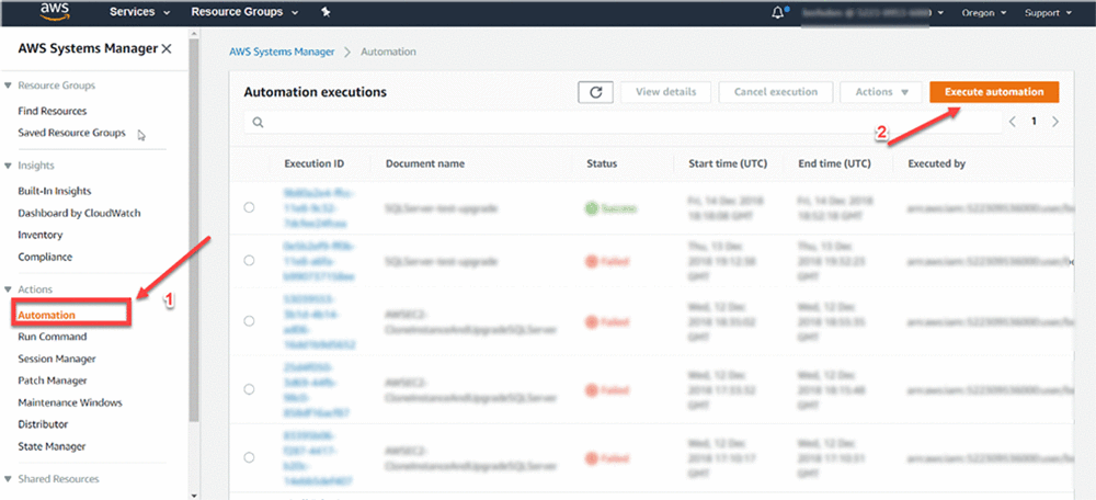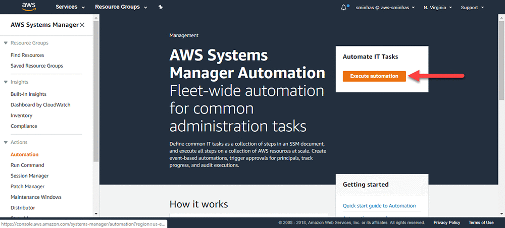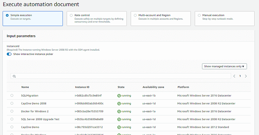 Una vez confirmada la lista de Managed Instance, vaya a la pestaña Automation de AWS Systems Manager y elija Execute Automation: