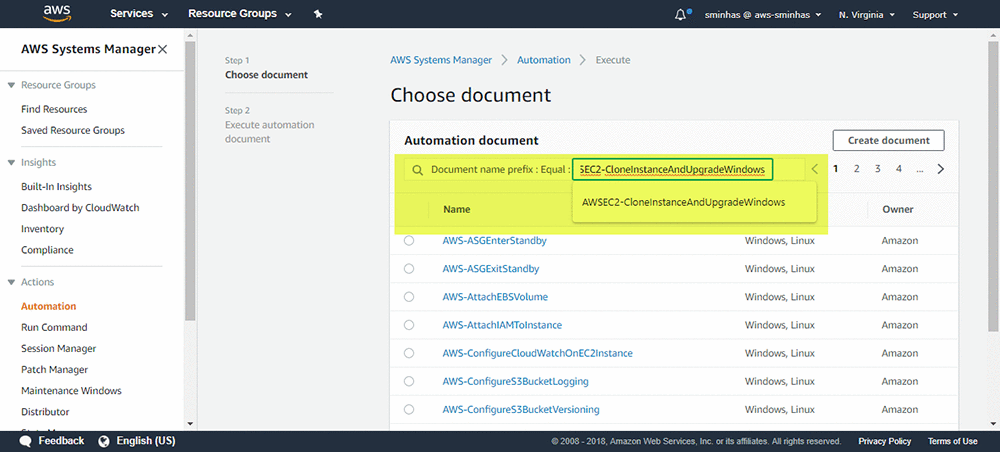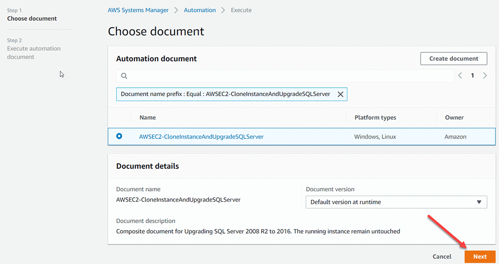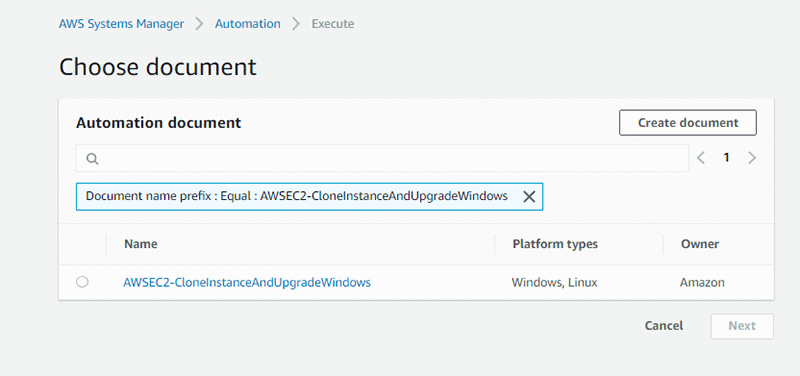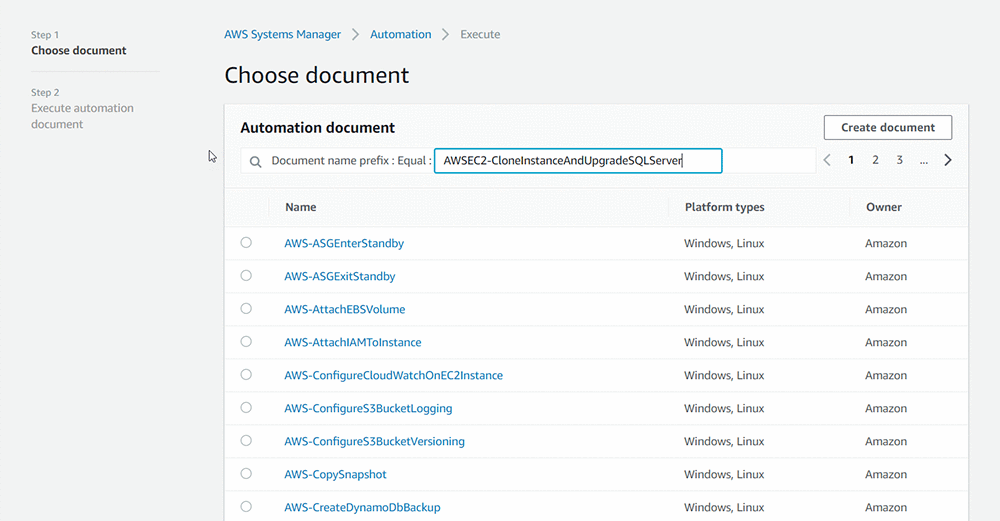 Para buscar el documento SSM AWSEC2-CloneInstanceAndUpgradeSQLServer, vaya a la barra de búsqueda, elija prefijo de nombre de documento, elija Equal y, a continuación, pegue en el nombre del documento (AWSEC2-CloneInstanceAndUpgradeSQLServer). Es importante tener en cuenta que este nombre distingue entre mayúsculas y minúsculas, así que asegúrese de que lo tiene correcto.