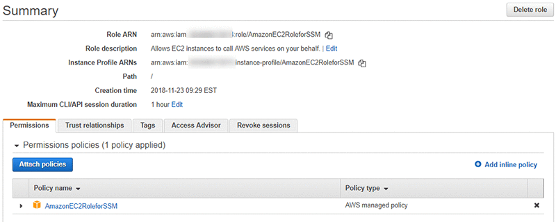 AmazonEc2RoleSSM adjunta al rol. A su vez, ese rol se adjunta a la instancia. Esto permite que el servicio de