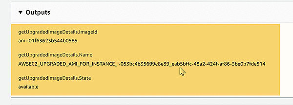 Una vez completada la automatización, la salida que se puede ver es el ID de la AMI (getUpgradeImageDetails.