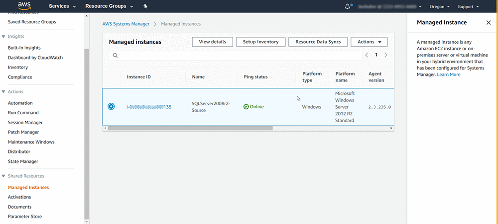 Como puede ver a continuación, la instancia se ha mostrado ahora como una instancia administrada (lo que significa que puede ejecutar comandos en su contra).