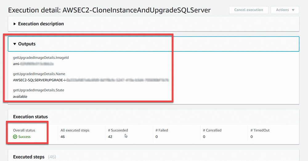 Después de ver el Execution Status, lea Success, elija la lista Outputs para ver la información de la AMI. Aquí puede ver el ID de la AMI. Ahora puede usarlo para iniciar la instancia de SQL Server 2016 para la VPC de su elección.