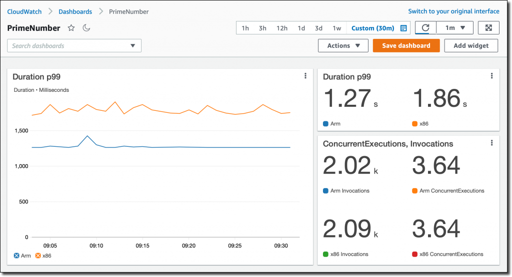 Para entender mejor lo que está sucediendo, creo un panel de control de CloudWatch para supervisar la duración de p99 para las dos arquitecturas. De esta manera, puedo comparar el rendimiento de los dos entornos para esta función y tomar una decisión informada sobre qué arquitectura utilizar en la producción.