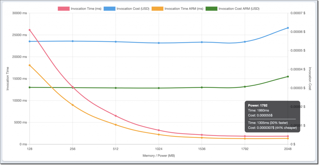 El proyecto de código abierto AWS Lambda Power Tuning, creado por mi amigo Alex Casalboni, ejecuta sus funciones con diferentes configuraciones y sugiere una configuración para minimizar los costes y/o maximizar rendimiento. El proyecto se ha actualizado recientemente para permitirte comparar dos resultados en el mismo gráfico. Esto resulta útil para comparar dos versiones de la misma función, una con x86 y la otra ARM.