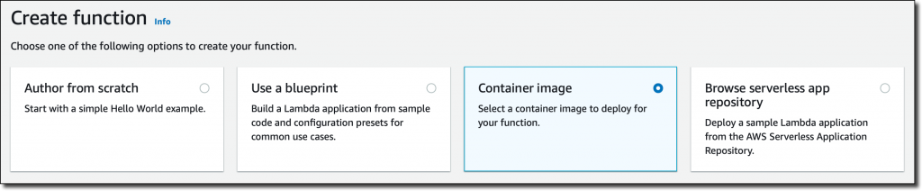 En la consola de Lambda, creo la función de random-letter-arm y selecciono la opción para crear la función a partir de una imagen de contenedor.