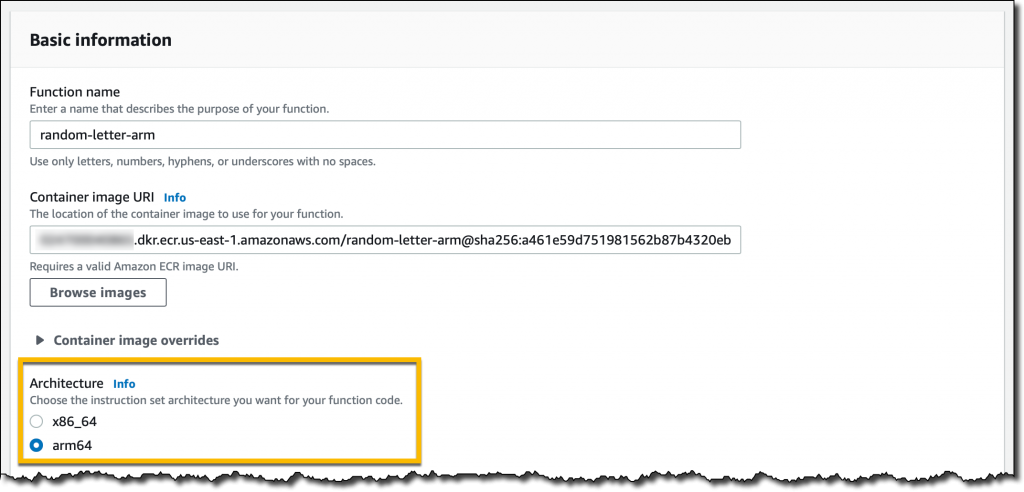 Tengo la intención de utilizar esta función en producción. Espero muchas invocaciones y busco opciones para optimizar mis costos. En la consola Lambda, veo que esta función utiliza la arquitectura x86_64.