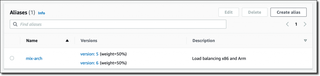 Utilizo un alias ponderado con un peso del 50% en la versión x86 y un peso del 50% en la versión ARM para distribuir las invocaciones de manera uniforme. Al invocar la función a través de este alias, las dos versiones que se ejecutan en las dos arquitecturas diferentes se ejecutan con la misma probabilidad.
