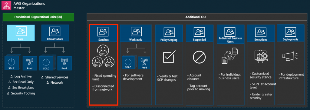 Esta es la estructura organizacional recomendada por AWS para el trabajo con múltiples cuentas, lo que no se considera acá es una forma automática de generar, controlar y eliminar recursos de las cuentas dentro de la unidad organizacional de “Sandbox”; o como también se conoce, ambientes bajos o desarrollo.