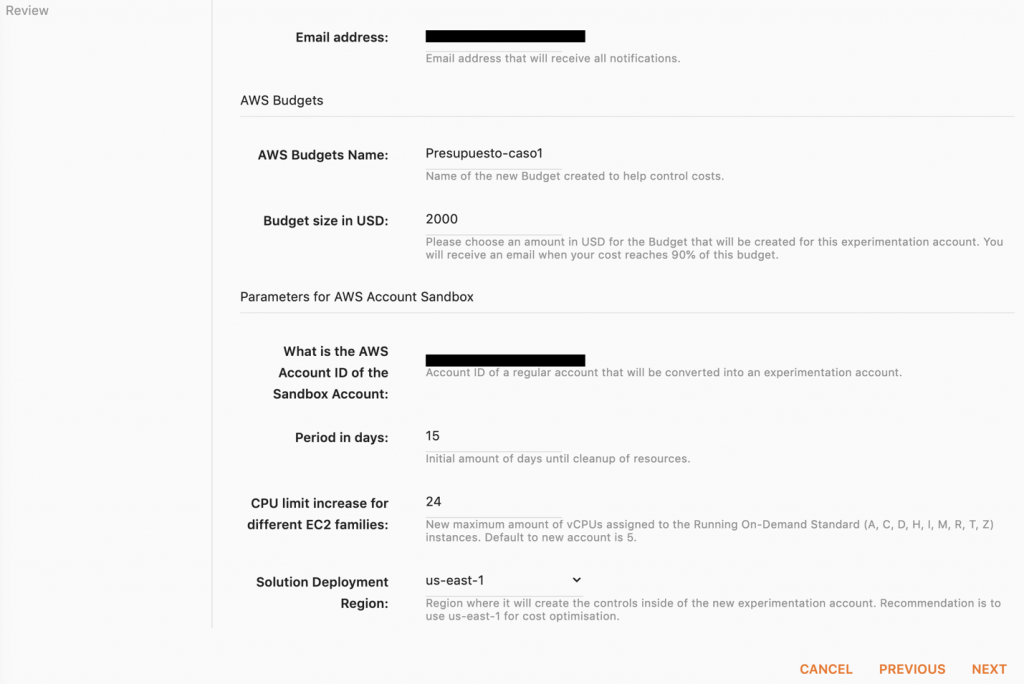 Su nueva cuenta, ahora en modo pruebas realizará una limpieza automática dentro de un ciclo recurrente, se creará una alerta en AWS Budgets para controlar los gastos, se creará un ticket de soporte para aumentar los límites de CPU para las instancias Amazon EC2 y el proceso de limpieza realizará un respaldo de todos los componentes de redes de la cuenta para poder reutilizarlos en del próximo ciclo de uso. También se creará una política de restricción de uso solo para las regiones us-east-1 y sa-east-1. Actualice la SCP SandboxRegions utilizando el servicio AWS Organizations para controlar la disponibilidad de los servicios en otras regiones.