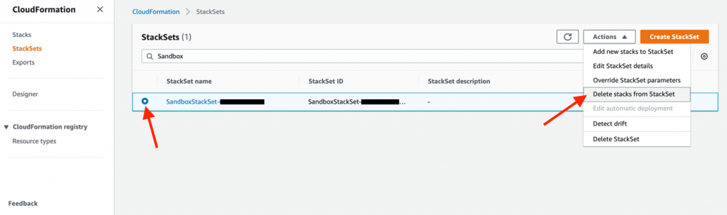 2- AWS CloudFormation: durante la creación se agregaron un stack y un stackSet, debemos eliminar estos elementos. Vaya a AWS CloudFormation y en el menú de la izquierda seleccione «StackSets». En la pantalla central aparecerá una lista de registros, uno de ellos tendrá un nombre en el siguiente formato: «SandboxStackSet-XXXXXXXXXXXX», donde las X es el número de cuenta donde se desactivará el modo pruebas. Seleccione el registro y, en la siguiente pantalla, use el menú «Actions → Delete stacks from StackSet».