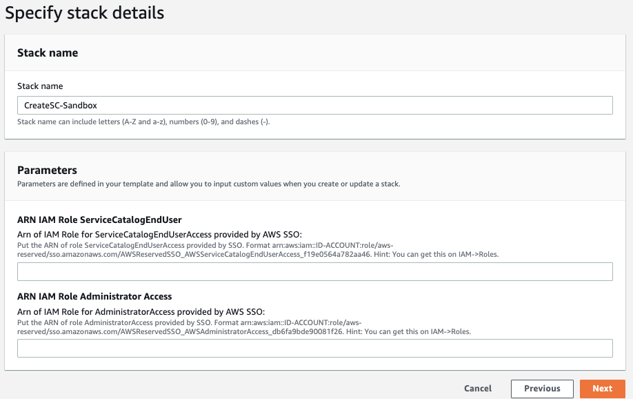 Al pasar al próximo paso del wizard de AWS CloudFormation se deben ingresar dos parámetros: ArnRoleAdmin y ArnRoleServiceCatalogSSO. Ambos son roles de IAM ya aprovisionados por AWS Control Tower y que pertenecen a AWS SSO.