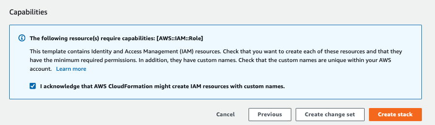 Una vez que los parámetros estén configurados, simplemente ejecute el script haciendo clic en siguiente, luego, seleccione el cuadro de opciones como se muestra a continuación y presione crear stack.
