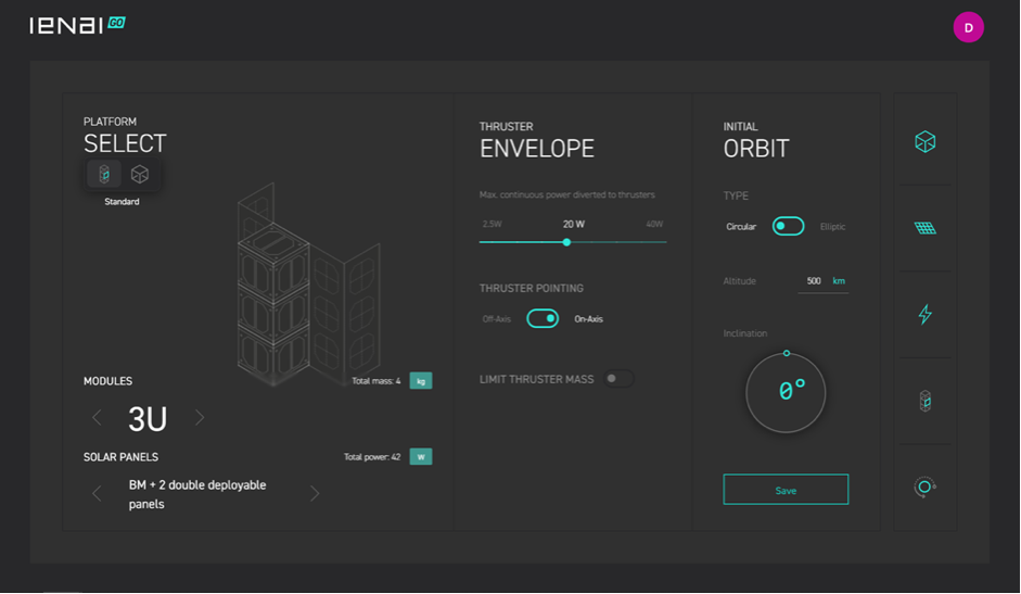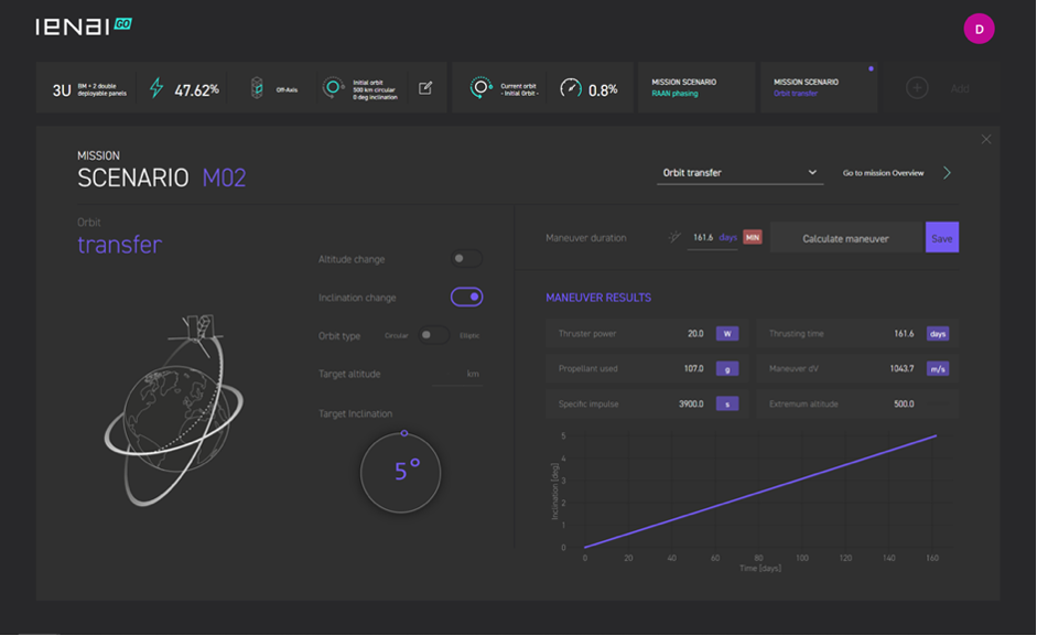 Las siguientes imágenes ilustran la interacción del usuario con la herramienta. ienai ha dedicado un esfuerzo considerable en asegurar que el software sea intuitivo (y atractivo) para todo tipo de usuarios (nivel iniciado, estudiantes y, como no, profesionales expertos de la industria espacial) y que la información representada sea coherente y fácilmente procesable. Ienai GO es un recurso eficaz e intuitivo que cualquier ingeniero puede utilizar durante la fase preliminar de diseño para poder entender mejor los requerimientos de propulsión en sus misiones y cómo la tecnología de ienai puede ayudarles a hacerlo realidad fácilmente.
