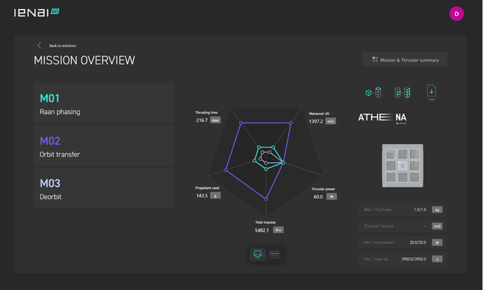1 ienai GO utiliza datos de las características de los satélites, su capacidad de generar potencia eléctrica en órbita así como las misiones a llevar a cabo para generar un diseño customizado del propulsor ATHENA, a diferencia de otros competidores que llevan a cabo el proceso inverso.