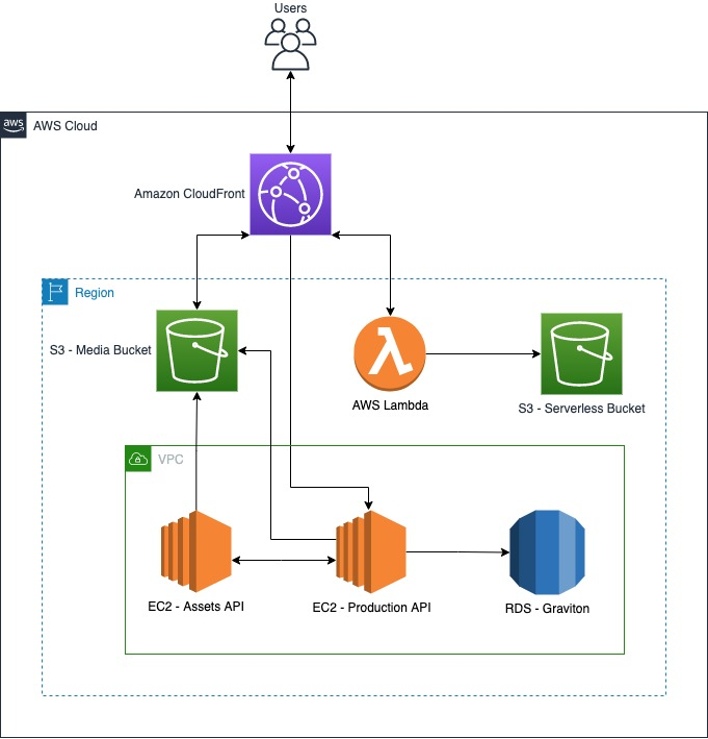El siguiente diagrama de arquitectura muestra su entorno de producción, donde se emplean instancias de cómputo (Amazon EC2) de gran capacidad (con entornos de desarrollo y «staging» replicados en instancias de menor capacidad).