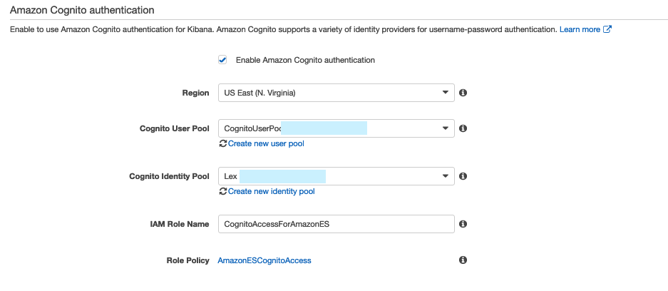 Al crear un dominio de Amazon Elasticsearch Service puede elegir que se realice la autenticación de Kibana mediante Amazon Cognito.