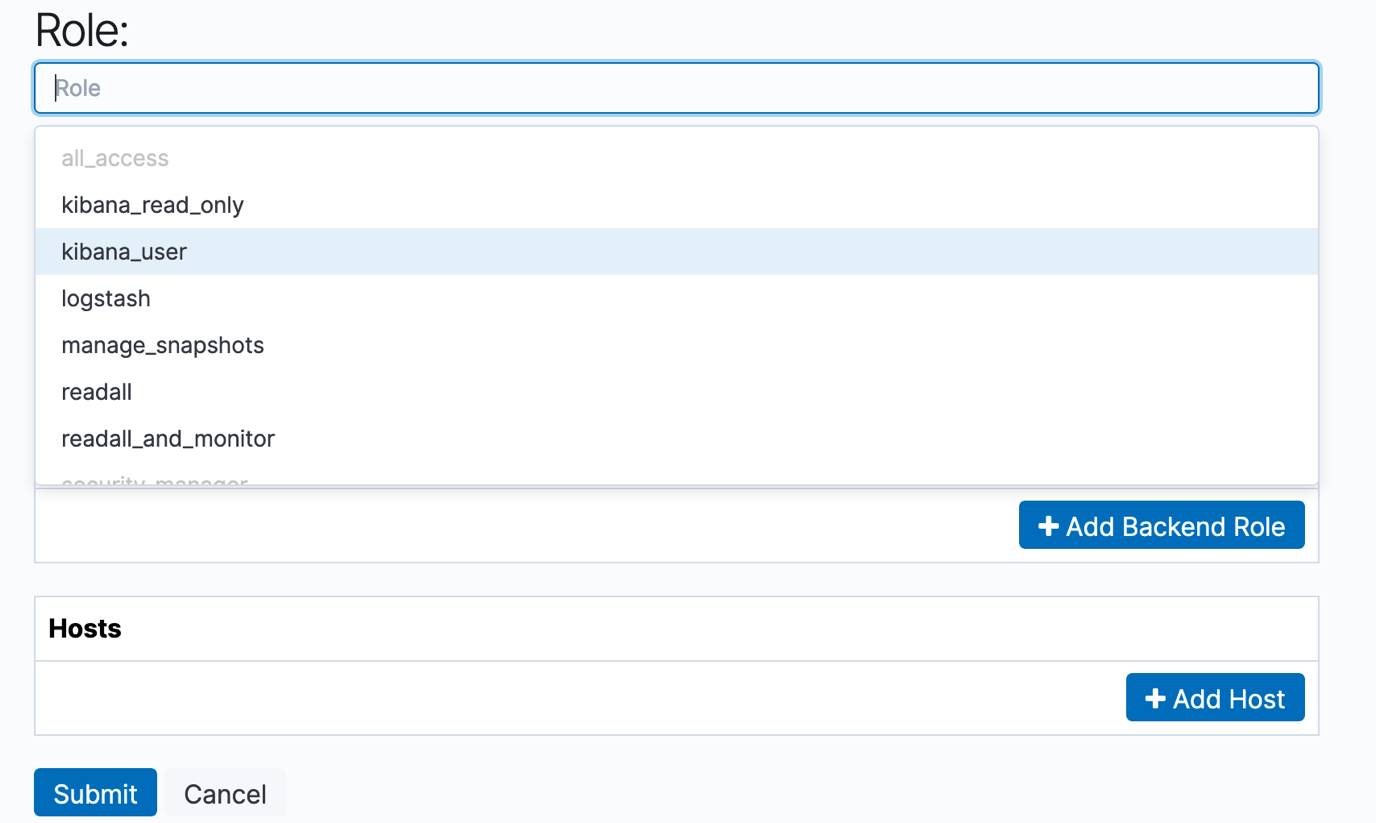 En la sección Seguridad, puede asociar roles de Kibana (que se muestran a continuación) con roles de AWS (a través del rol IAM ARN).