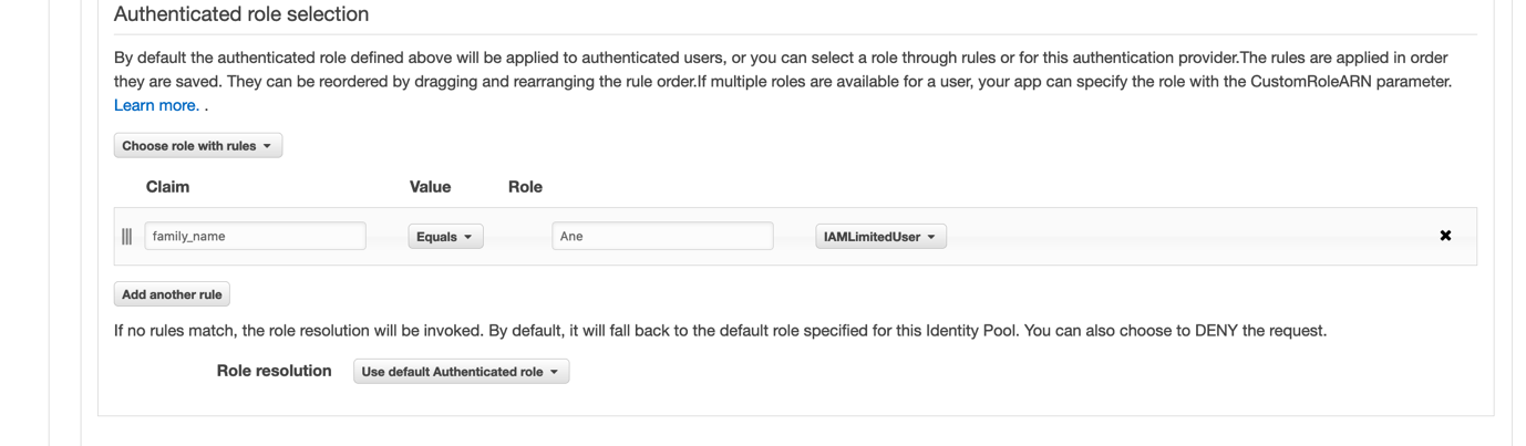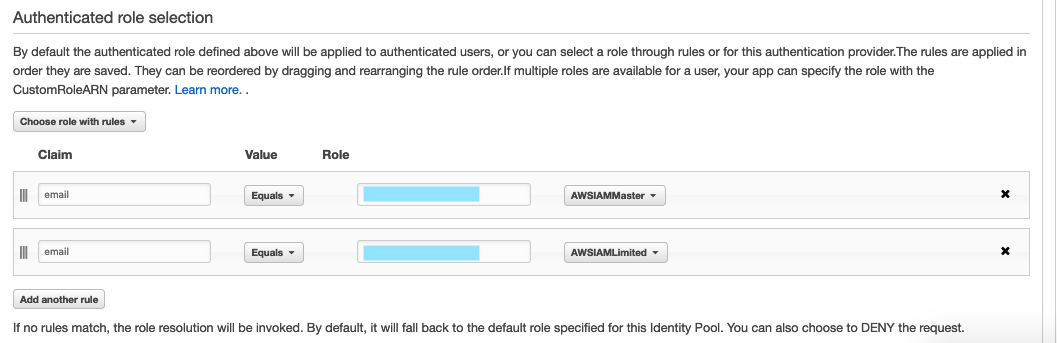 En el grupo de identidades de Cognito, configure la sección Proveedores de autenticación, donde debe apuntar al grupo de usuarios de Cognito, ya que proporcionará autenticación. En esta parte se selecciona el rol Autenticado, es decir, aquí es posible asociar usuarios autenticados con roles específicos según reglas predefinidas (menú que se muestra abierto en la captura de pantalla a continuación). Las reglas se aplican en el orden en que se guardan. Se pueden reordenar arrastrando y reorganizando el orden de ellas. Si hay varios roles disponibles para un usuario, la aplicación puede especificar la función con el parámetro CustomRoleEearn.