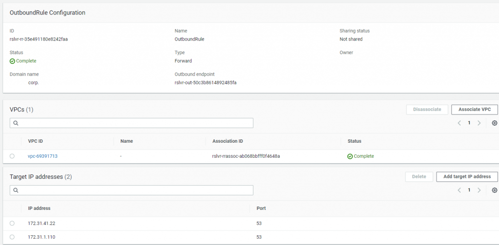 Esta regla reenviará las solicitudes de resolución DNS del dominio “domain.corp” a los Domain Controllers de este entorno, que tienen servicios DNS [172.31.41.22 y 172.31.1.110].