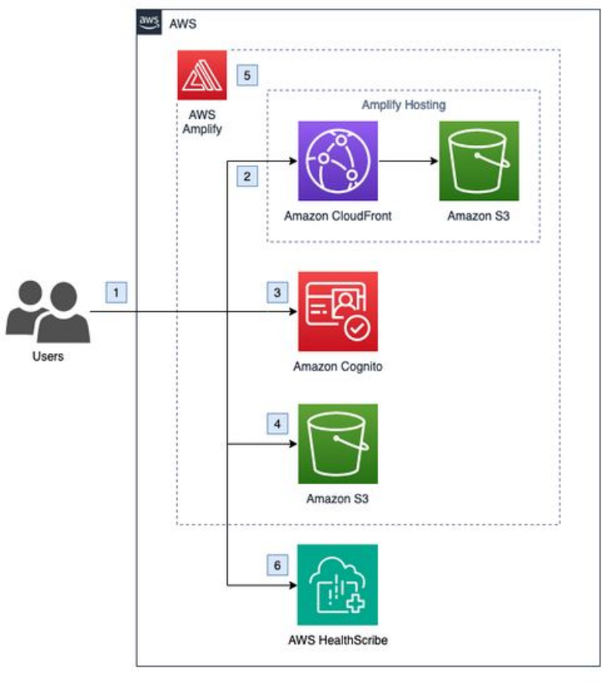 Aunque aún está en etapa de preview, AWS HealthScribe está disponible como versión de demostración para que tu empresa o institución de salud pueda comprender con mayor detalle cómo se puede desplegar fácilmente un servicio que utilice los modelos de Inteligencia Artificial Generativa en una aplicación de alta complejidad, que puede simplificar los tiempos y procesos de atención y documentación de servicios de salud. Utilizando AWS Amplify, esta versión de demostración crea el ambiente necesario para que pueda experimentar todas las capacidades de este servicio en un entorno seguro y controlado dentro de tu empresa. La arquitectura de este modelo de demostración se muestra a continuación. Por favor considere que el despliegue de estos servicios desde la consola de AWS puede generar cargos por consumo de servicios.