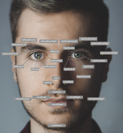 - Puntos faciales — Una variedad de puntos de referencia faciales. Para cada punto de referencia (como el ojo izquierdo, el ojo derecho y la boca), la respuesta proporciona coordenadas x,y.