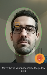El desafío del movimiento de la nariz se realiza con un cuadrado en la pantalla, que aparece al azar, en el que el cliente/usuario debe asociar la punta de la nariz al cuadrado una vez. La aplicación podría incluir más de un desafío, como 2 movimientos de la nariz y en consecuencia de la cabeza, o parpadeo de los ojos, etc.