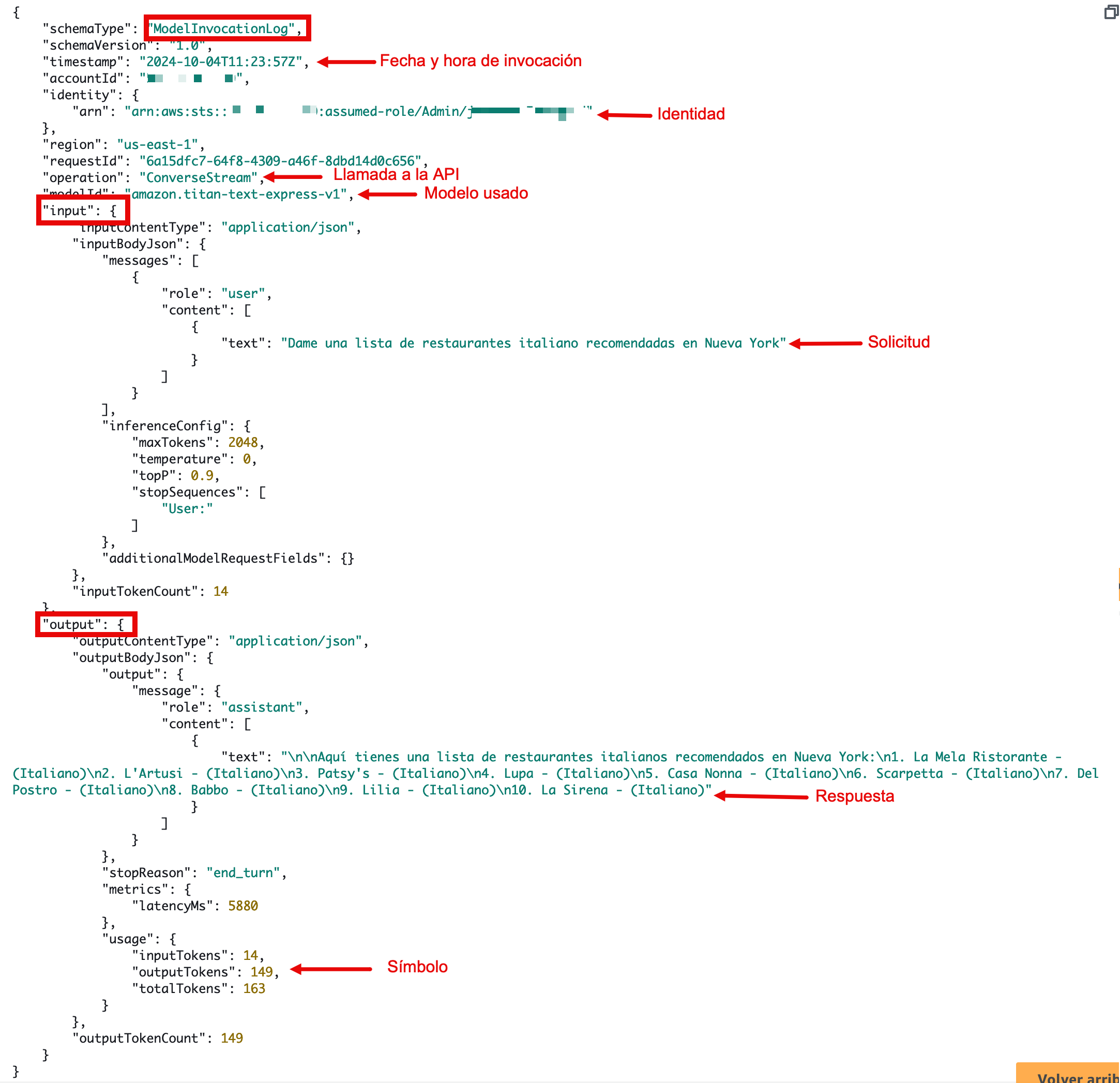 Figura 2: Registro de invocación del modelo de muestra que incluye la solicitud y la respuesta