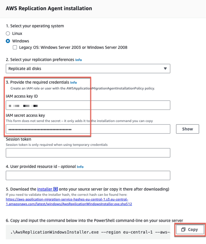 Utiliza las opciones de la Figura 10 para crear el comando de instalación, añadiendo su IAM Access Key e IAM secret Access key. Copia el comando resultante y descarga el instalador.