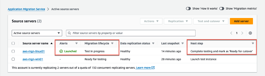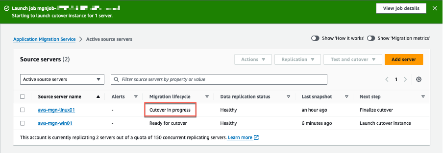 3. Puedes confirmar que se ha iniciado el lanzamiento de la instancia de prueba, observando varios indicadores en la página Source servers (Figura 13).