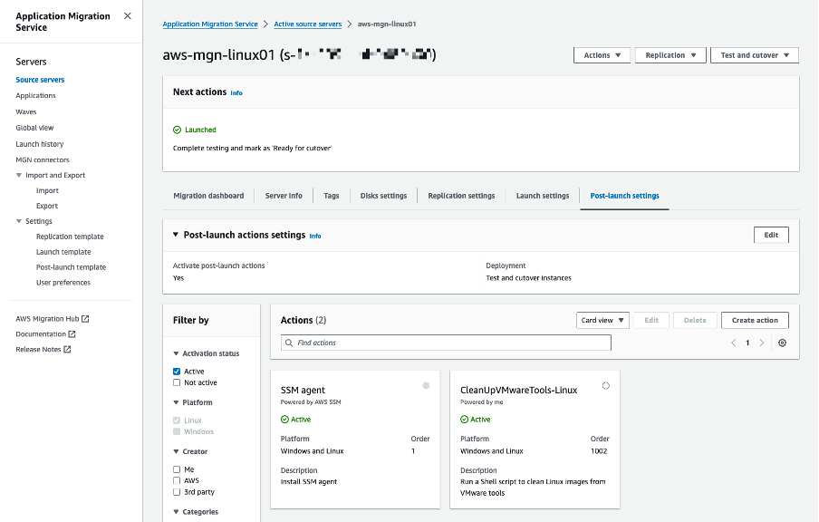 Esta solución aprovecha las post-launch actions (acciones posteriores al lanzamiento de la instancia EC2) del Servicio de Migración de Aplicaciones para instalar el agente de AWS Systems Manager (AWS SSM) en cada instancia de prueba (test instance) o de transición (cutover instanwice) lanzada. El agente de AWS SSM permite la ejecución de scripts personalizados, como la eliminación de las herramientas propietarias de VMware.