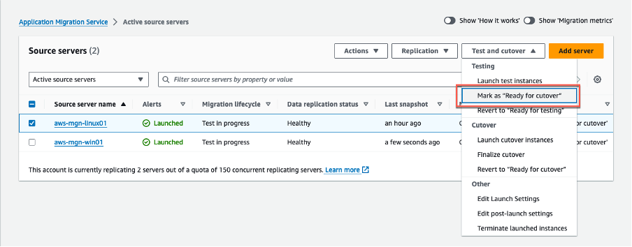 Cuando las pruebas estén completadas y esté preparado para la fase de cutover (transición), puedes concluir la prueba. Para hacerlo, cambia el estado del ciclo de vida de migración de sus servidores de origen a Ready for cutover. Esto indica la finalización de todas las pruebas y la preparación para la transición. Eventualmente, finaliza el ciclo de vida test in progress (prueba en progreso) seleccionando Terminate test launched instances.