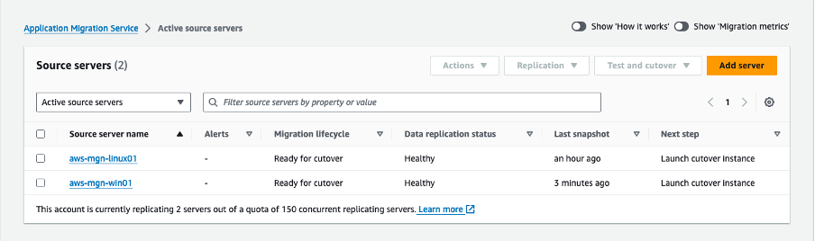 La consola del Application Migration Service confirmará que los servidores fueron marcados como listos para la transición.