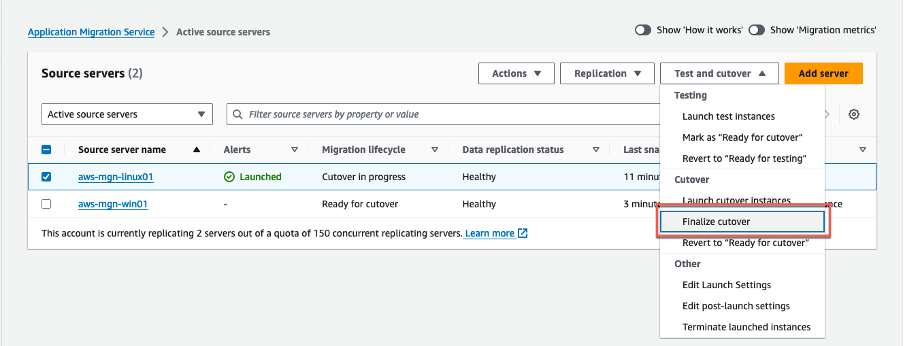 En el diálogo Finalize cutover for X servers, selecciona: Finalize para iniciar la transición. Esta acción actualizará el Migration lifecycle de tus servidores de origen a: Cutover complete, indicando una transición y migración exitosas. También detendrá la replicación de datos y descartará los volúmenes AWS EBS asociados y los servidores de replicación de Amazon EC2. La consola del Servicio Application Migration Service mostrará Cutover finalized cuando la transición se haya completado con éxito.