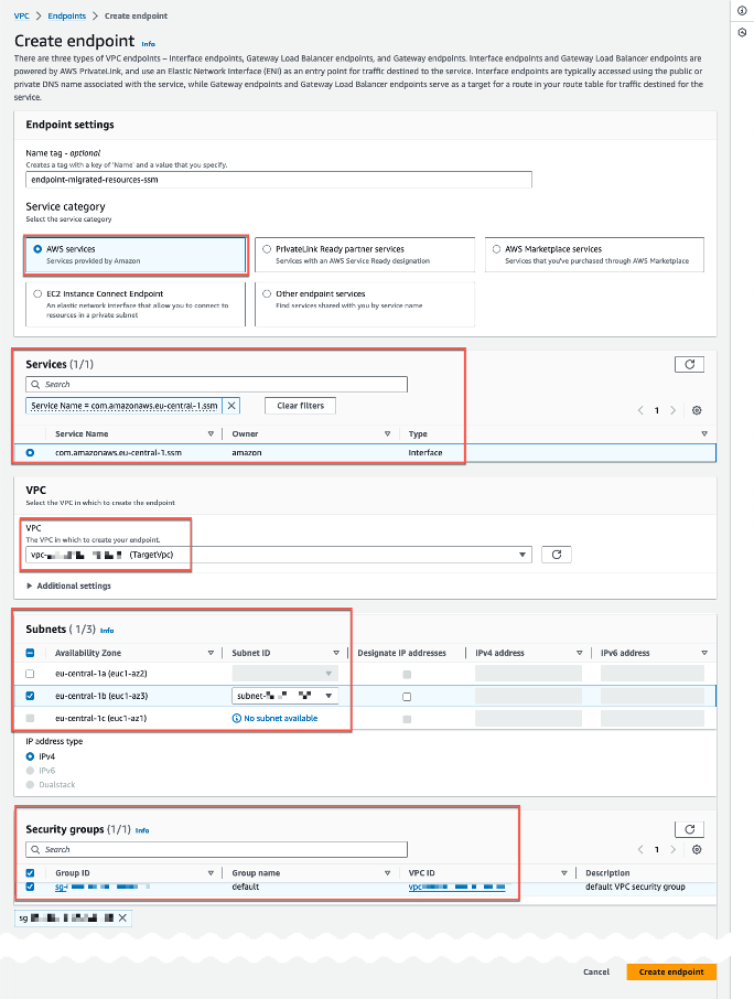 2. Selecciona AWS services (Servicios de AWS) y crea el primer punto de enlace (Figura 3) amazonaws.<región>.ssm. Reemplaza <región> con la Región de AWS. Selecciona la VPC en la que se va a crear el punto de conexión. El grupo de seguridad adjunto al punto de conexión de VPC debe permitir conexiones entrantes en el puerto 443 desde la subred privada de la instancia gestionada. Finalmente, selecciona Create Endpoint (Crear punto de conexión) al final de la página.