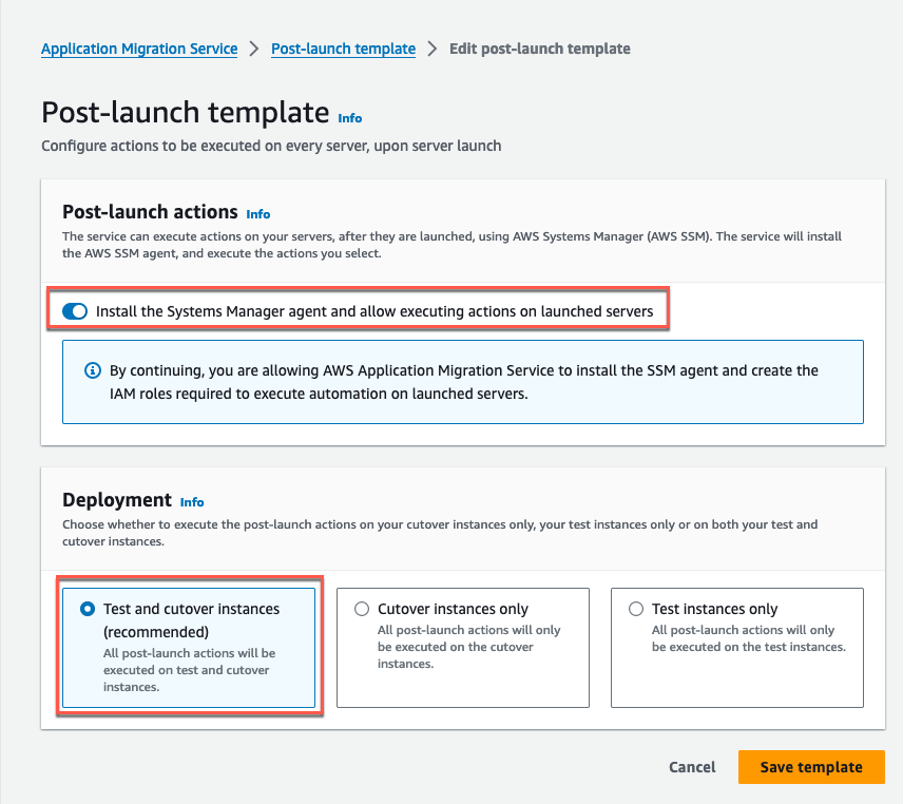 1. Accede a la plantilla seleccionando: Post-Launch template (Plantilla posterior al lanzamiento) en el panel izquierdo. Edita la configuración de las post-launch actions (acciones posteriores al lanzamiento) y activa Systems Manager agent installation on launched Test and cutover instances (recommended). Para finalizar, selecciona Save template (Guardar plantilla) (Figura 5).