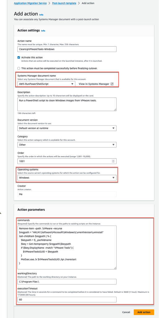 3. Añade la siguiente información en los action settings (Figura 7). Los post-launch scripts en Windows se ejecutan bajo el contexto de Servicio Local.