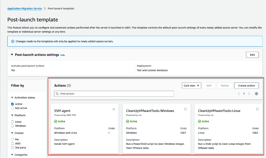 La post-launch template (Figura 9) mostrará las dos acciones recién creadas. Valida que estén configuradas como Active (Activa).