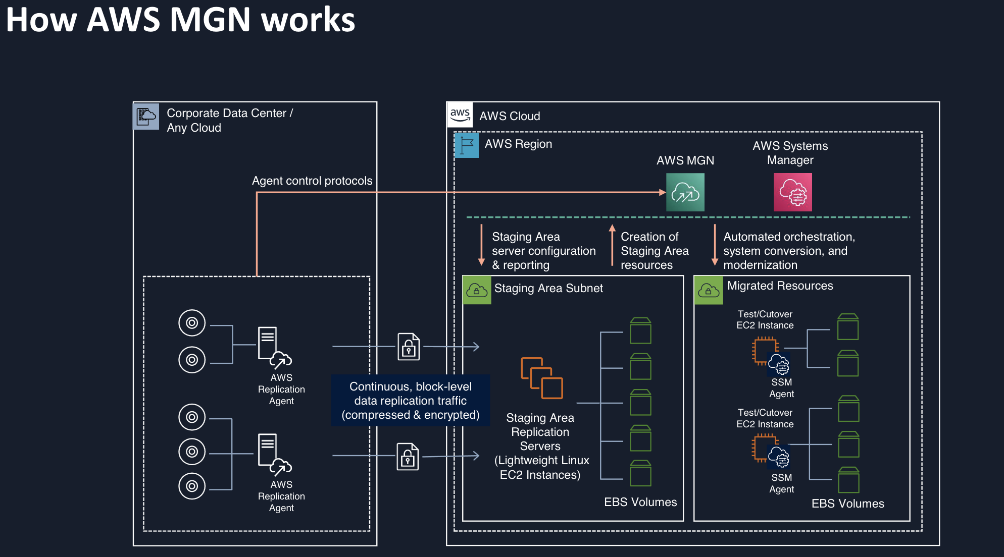 Con la estrategia de migración definida y la preparación de la nube lista, pasamos a la tercera fase: Migración y Optimización. AWS Application Migration Service permite migrar las aplicaciones sin realizar cambios, copiando los discos duros de origen y replicándolos en la nube en el AWS Migration Hub, que es un entorno temporal y colaborativo que permite llevar el control y seguimiento de cada aplicación migrada. MGN tiene un amplio soporte de sistemas operativos, aplicaciones y bases de datos y es una herramienta que permite hacer migraciones en gran escala de manera robusta, predecible, sin afectar a las aplicaciones productivas y de forma automatizada. Existen otras herramientas de migración, como AWS Database Migration Service (DMS), Cloud Migration Factory o AWS DataSync, que también pueden ayudar a hacer las migraciones de forma masiva.