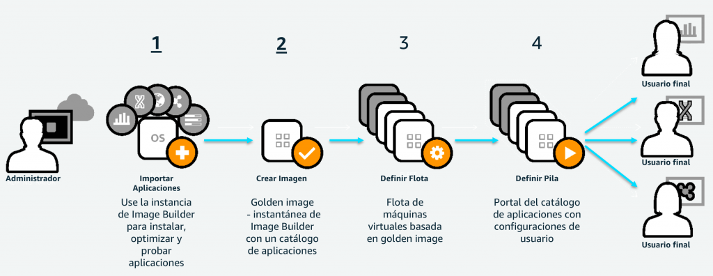 Los pasos del proceso de configuración de Amazon AppStream 2.0 son presentados abajo: