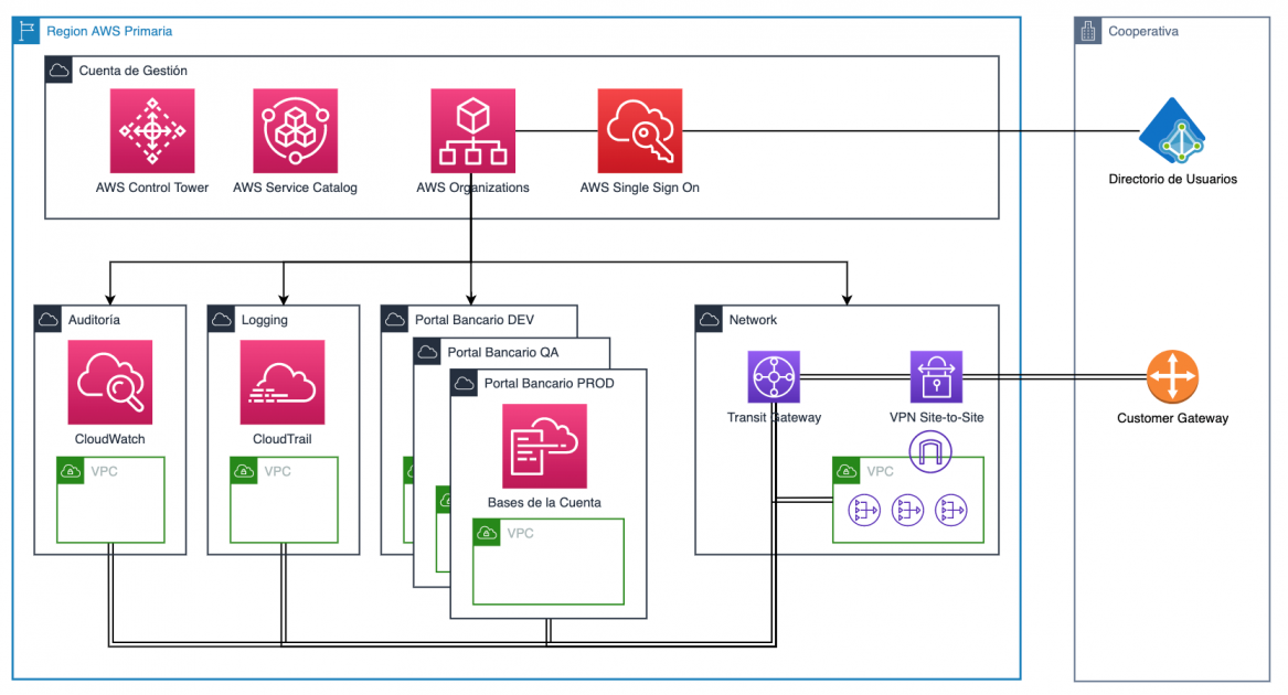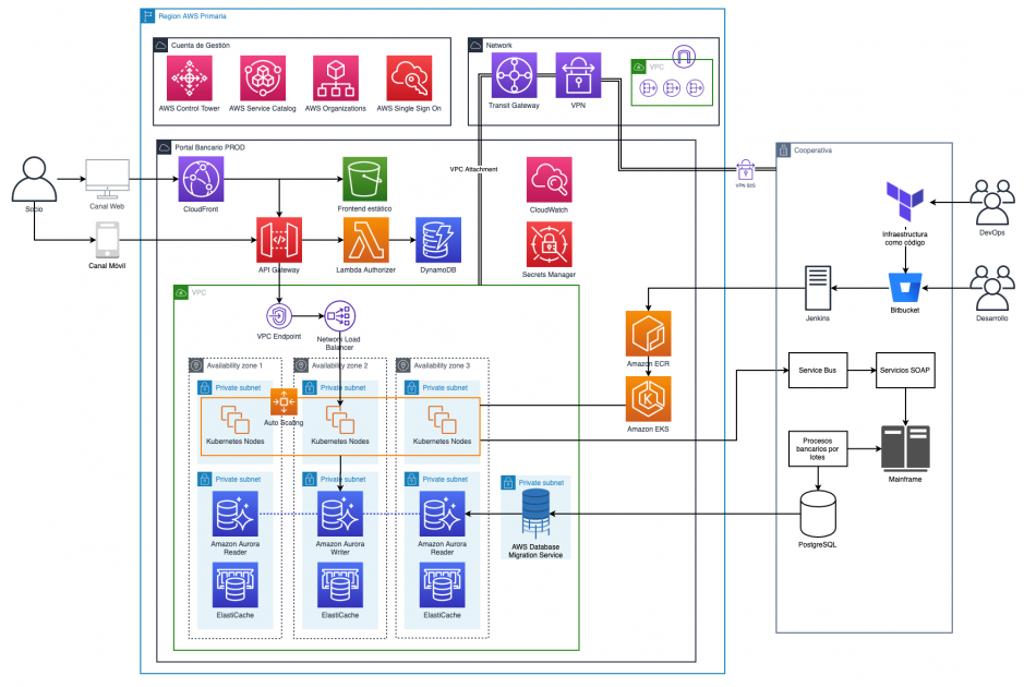 Para lograr los objetivos de nivel de disponibilidad, escalabilidad, y agilidad, se implementó un entorno de varias cuentas, seguro y basándose en prácticas recomendadas utilizando AWS Control Tower. Esto le permite a la organización aprovisionar cuentas de AWS nuevas con tan solo unos clics, y tener la confianza de que las cuentas cumplen con todas las políticas de la organización. Bajo esta arquitectura de gobierno, no solo se habilitó el despliegue del nuevo portal bancario, sino que también sentó las bases para las cargas de trabajo futuras.
