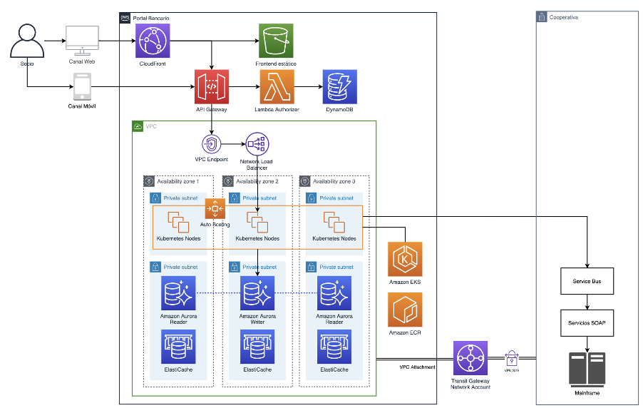 - Integración con el núcleo del sistema bancario (core banking system) que se ejecuta en el Mainframe en el entorno local de la organización a través de un enlace Virtual Private Network (VPN) La funcionalidad se expone a través de un Bus de Servicios, habilitando un modelo híbrido de aplicaciones nativas de nube y al mismo tiempo de arquitectura orientada a servicios (SOA).