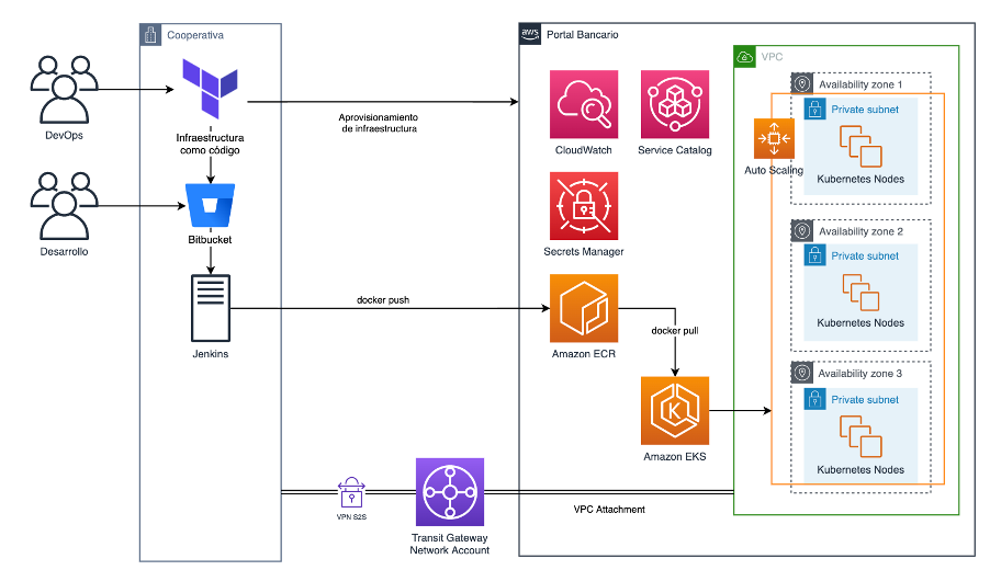 Actualmente, la industria financiera se enfoca en entregar experiencias mejoradas a los usuarios. Esto implica para las empresas entregar funcionalidades más rápido, cumpliendo con estrictos requerimientos de seguridad y control al mismo tiempo. Además, la interacción con recursos en infraestructura local permite aprovechar la capacidad tecnológica que las empresas han construido por mucho tiempo. Descubra a continuación cómo una institución financiera logró cumplir con sus objetivos de gobernanza, seguridad, escalabilidad, entrega continua y despliegue continuo (CI/CD), así como interacción con su infraestructura local utilizando la nube de AWS.