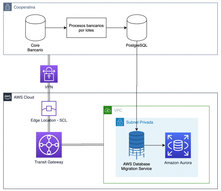 Debido a que el core bancario se ejecuta en un entorno local, la organización cuenta con procesos que son ejecutados en ese mismo entorno, por lo cual aprovechó el servicio de AWS Database Migration Service (DMS), un servicio de migración de datos de forma rápida y segura, para cargar los resultados de distintos procesos bancarios a la nube. La comunicación entre el entorno local y la nube de AWS se realizó de manera segura a través de un enlace Virtual Private Network (VPN), que además incluyó el uso de AWS Global Accelerator, que envía el tráfico desde la red local a la ubicación de borde de AWS más cercana (en Chile) utilizando la red global de AWS para proporcionar el mejor rendimiento de la aplicación. Como resultado de esta configuración, la organización logró realizar cargas de más de 2 millones de registros en tan solo 3 minutos.