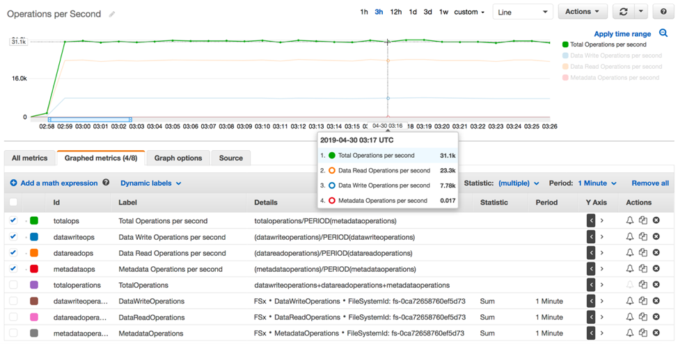Estas métricas mencionadas anteriormente se envían a CloudWatch en intervalos de un minuto y están disponibles durante los siguientes 15 meses, de modo que puede acceder a la información histórica sobre sus cargas de trabajo de almacenamiento de archivos en Windows en el tiempo. Las diferentes métricas de *Bytes muestran la cantidad de bytes por operación sobre el sistema de archivos, como leer y escribir. Las diferentes métricas de *Operations muestran la cantidad de operaciones. Para mostrar el rendimiento o IOPS de las diferentes operaciones, pueden usarse cálculos matemáticos sobre estas métricas. Éstos se conocen como expresiones matemáticas dentro de CloudWatch. Se pueden desarrollar métricas nuevas con expresiones matemáticas, ya que se pueden combinar y realizar diferentes cálculos matemáticos en métricas existentes. Por ejemplo, para encontrar el número total de bytes por operaciones en el sistema de archivos, agregue DataReadBytes y DataWriteBytes. Y para encontrar el número total de operaciones en el sistema de archivos, agregue DataReadOperations, DataWriteOperations y MetadataOperations. También se puede agregar un elemento de tiempo a las expresiones matemáticas para calcular métricas como el rendimiento en MB/s y número de operaciones en el sistema de archivos por segundo. A continuación, se muestran algunos ejemplos de expresiones matemáticas que pueden construirse con las métricas de FSx en CloudWatch.