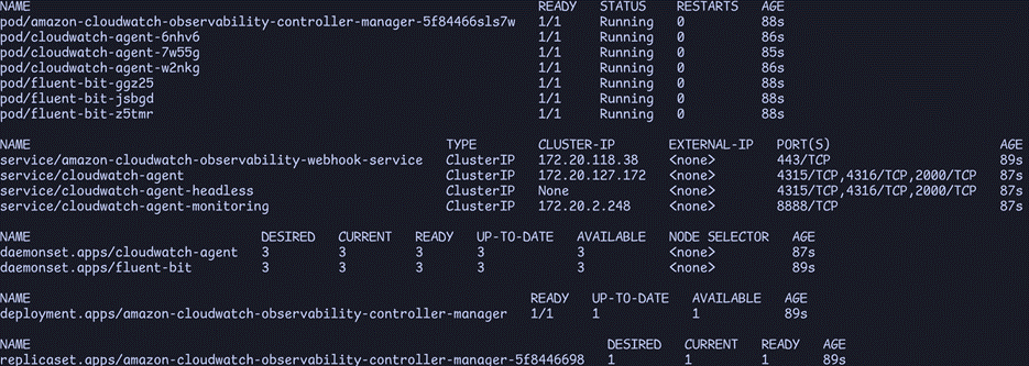 Estos recursos se despliegan en el Namespace amazon-cloudwatch por lo tanto para obtener los recursos desplegados en ese namespace se ejecuta el comando: