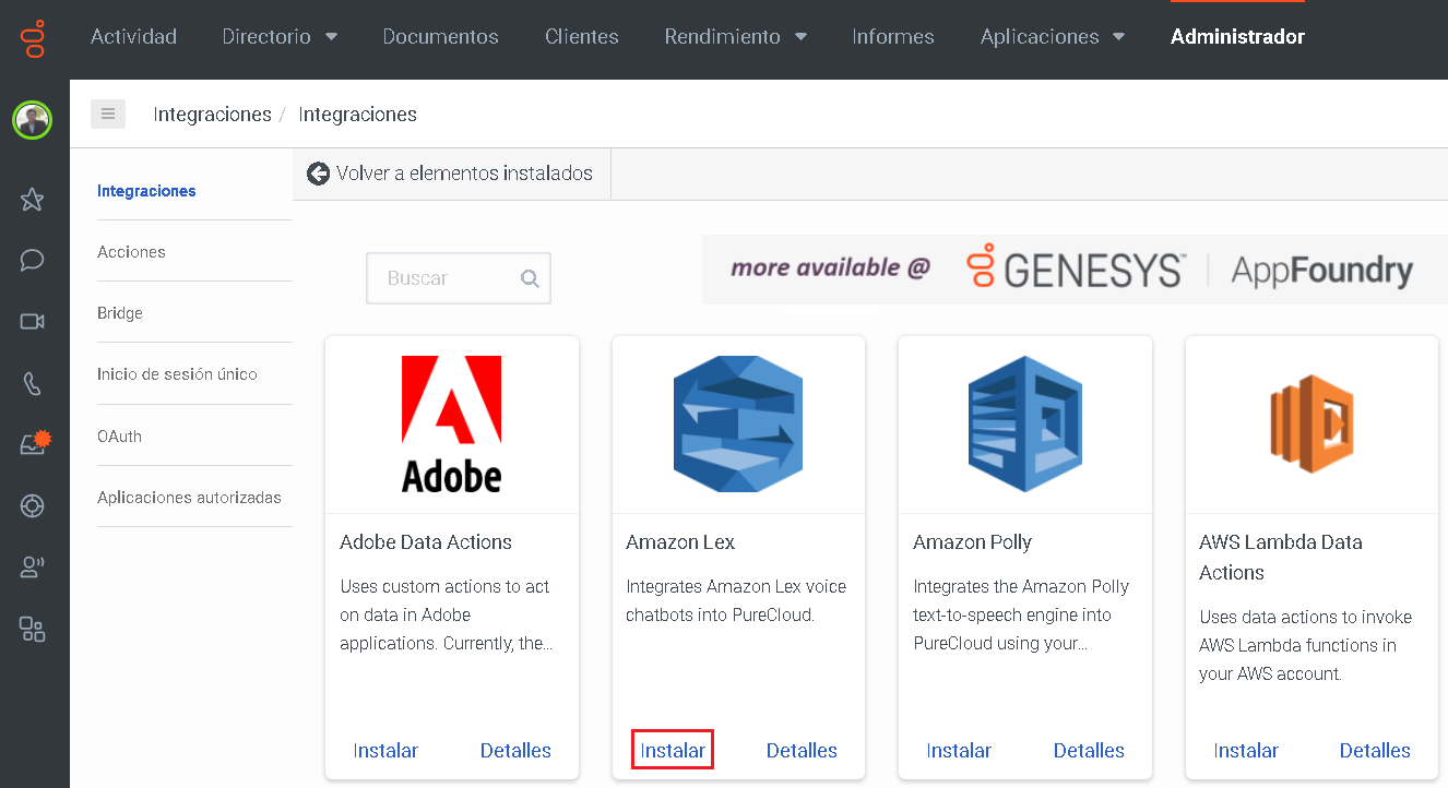- Instale la integración de Amazon Lex desde Genesys AppFoundry (Marketplace de Genesys)