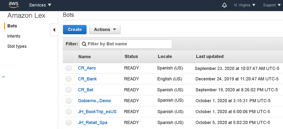 Para la integración vamos a asumir que ya se tiene un Amazon Lex Bot en alguno de los idiomas soportados, por ejemplo, en Español-US (liberado recientemente). En este escenario y a forma de ejemplo, el bot va a permitir implementar una interfaz conversacional que permita a los usuarios validar información, disponibilidad y comprar ciertos productos, al igual que gestionar la orden de compra, posibilitando el seguimiento, modificación y cancelación de esta. Todos estos se ven como intenciones o “intents” configurados en el bot.