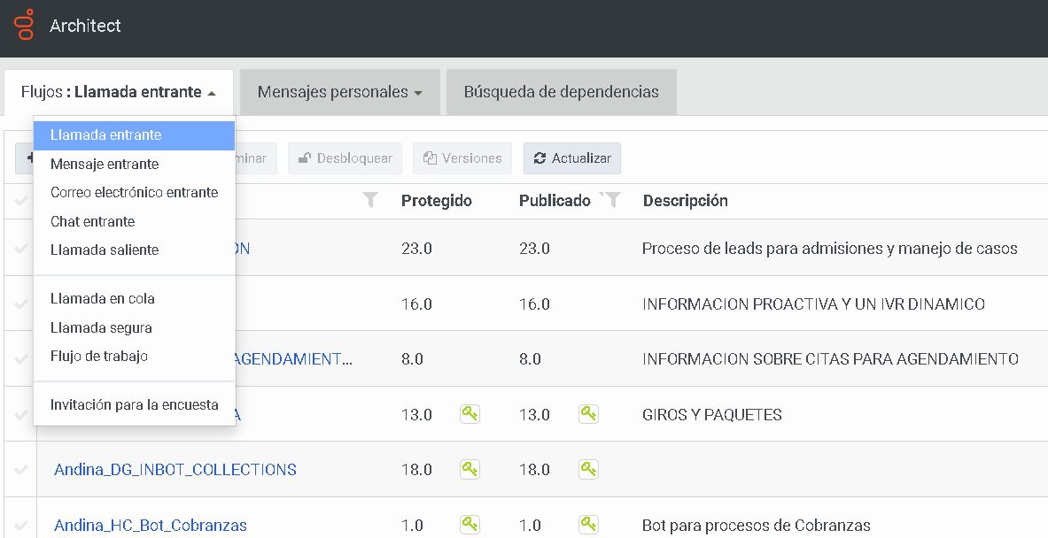 Para poder utilizar nuestro bot de gestión de compras del ejemplo, un usuario administrador ingresa a la interfaz de Architect (interfaz de Genesys Cloud para configurar los diferentes flujos) y, una vez ha seleccionado el tipo de flujo a modificar, puede hacer uso de las diferentes herramientas disponibles para su construcción.
