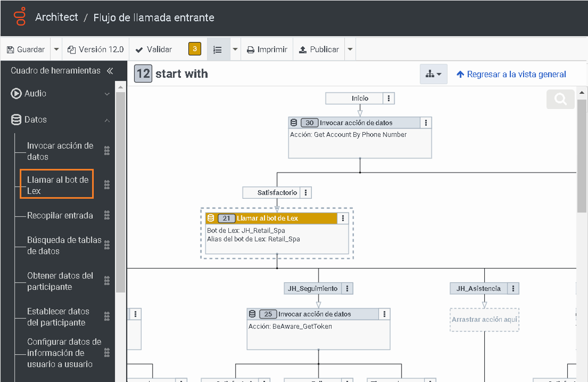 De esta forma puede utilizar cualquier bot que haya construido dentro de los flujos. En este ejemplo en particular, en el flujo de voz, primero buscamos identificar al cliente por medio de una consulta a la plataforma de CRM y posterior a esto, le presentamos al bot.
