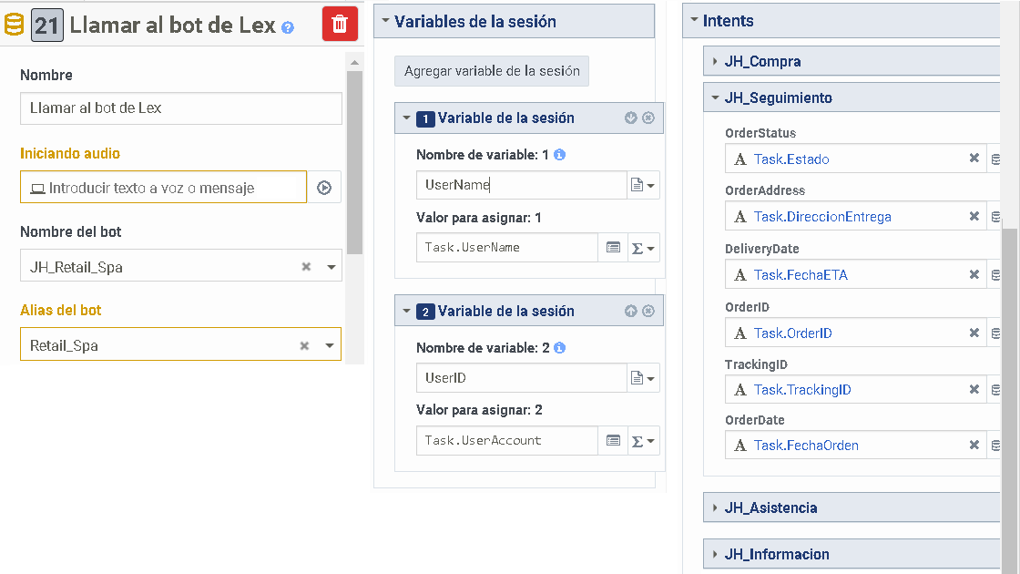 En nuestro ejemplo, de los diferentes bots vamos a utilizar “JH_Retail_Spa”, en donde se le pasan dos variables que hemos traído del CRM: Task.UserName y Task.UserAccount y, de las diferentes intenciones programadas, nos detenemos en la que procesa solicitudes de seguimiento donde vemos la información que el bot nos devuelve.